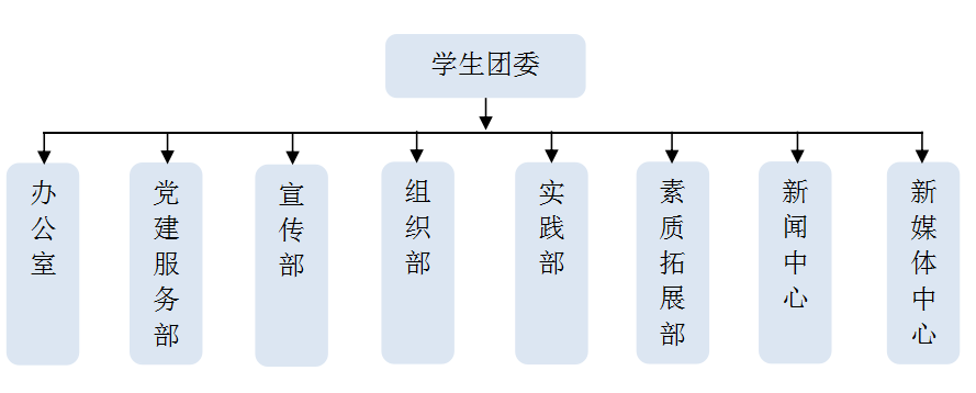 团委根据党建、团建、社会实践等不同职责,共设有八个部门,各部门间本着“分工不分家”的原则,相互协调、相互合作,全面服务学生的组织和教育。