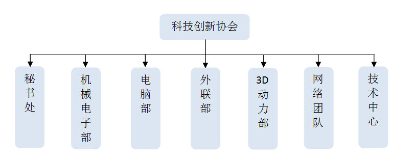 科技创新协会由秘书处、外联部、电脑部、机械电子部、网络团队、技术中心、3D动力部七个部门组成,各部门团结合作,共同支撑科技创新协会的正常运转。