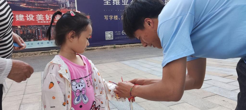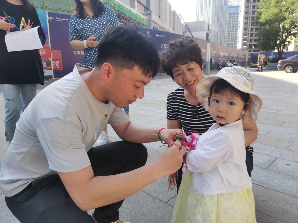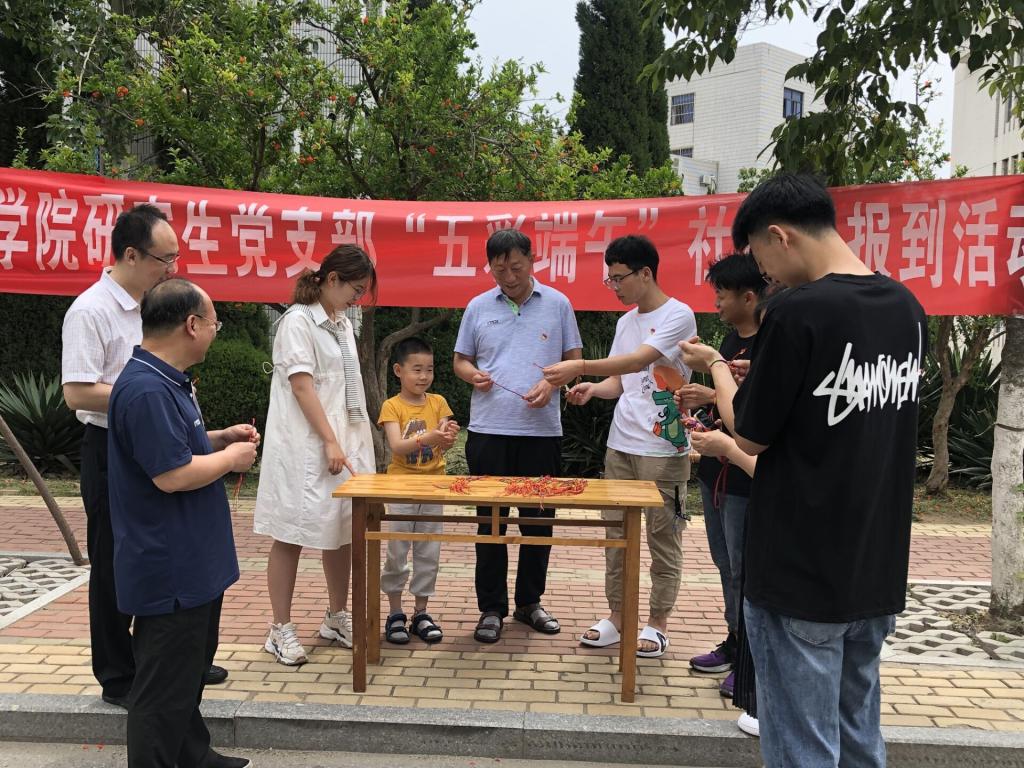 “轻汗微微透碧纨,明朝端午浴芳兰。流香涨腻满晴川,彩线轻缠红玉臂,小符斜挂绿云鬟,佳人相见一千年。”宋代词人苏轼的笔下,就曾出现了端午系五彩绳的习俗。为孩子系五彩绳是端午节的重要习俗,它有祈福纳吉的美好寓意。为了给华润社区的老人和孩子送上祝福,tyc5997太阳集团于端午期间举行了“五彩端午”社区双报到活动。机电学院党总支书记唐斌、院长马国清、副院长于涛、组织员勇玲娥以及研究生党支部党员参与了本次活动。