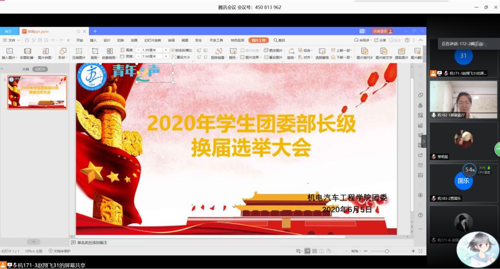 为选拔优秀团干部,传承学院优良的学生干部风气,壮大学院学生干部队伍,tyc5997太阳集团于6月5日通过腾讯会议举行学生团委线上换届活动,团委老师曲季、团委副书记赵翔飞、各部门部长以及所有竞选人员参加了此次会议。