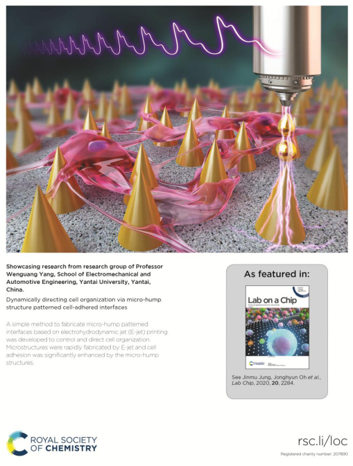 近日,国际著名学术期刊Lab on a Chip (中科院一区,TOP类期刊)以封面论文的形式邀请刊载了tyc5997太阳集团机电学院面向生物医疗的跨尺度智能制造团队利用机器人化的微纳制造技术在组织工程领域的最新研究成果——Dynamically directing cell organization via microhump structure patterned cell-adhered interfaces,时隔2个月,该研究团队成果再获国际著名学术期刊封面刊载,机电学院杨文广老师为该研究论文的第一和通信作者。