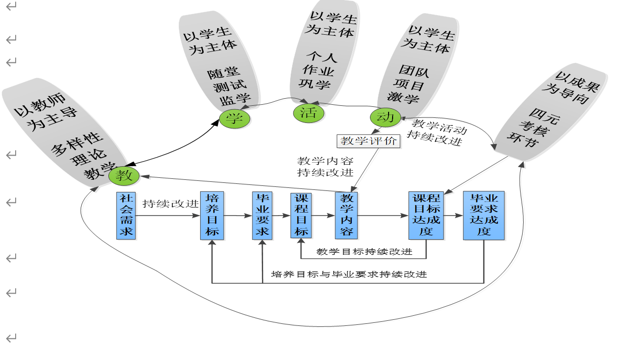 图2 融合OBE理念与系统思维的“新工科”五指掌式教学模式